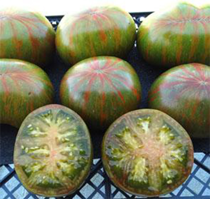 (США) Сорт Брэда Гейтса. Зеленоплодная вариация сорта Berkeley Tie Dye. Плоды полосатые с красными и зелёными полосками, мясистые, вкусные, сладкие. Мякоть зеленая с красными и жёлтыми прожилками. Мясистые, не трескаются. Приятный сладкий фруктовый вкус с кислинкой. Сорт хорошо завязывает плоды в жаркую летнюю погоду. Высокоурожайный сорт. Высота куста - 1,5 м. Масса плодов: 190-460 г. Среднего срока созревания.