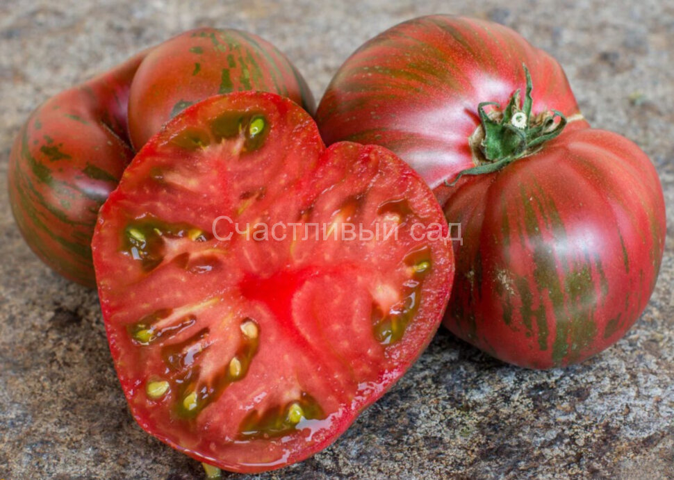 Плоды шоколадного цвета с зелёными и фиолетовыми полосами, ароматные, превосходные на вкус. Они растут кистями, от трех до пяти штук. Растения с простыми морщинистыми листьями. Можно выращивать в больших контейнерах. Высокоурожайный сорт. Масса плодов: 150-250 г. Ранний. Высота куста - 1 м.