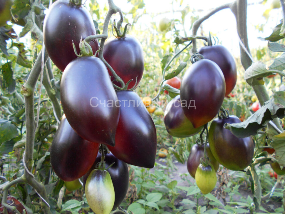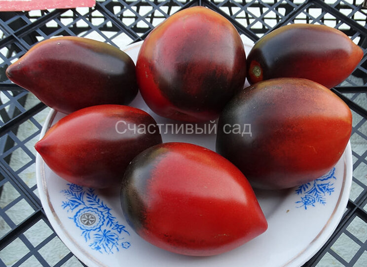 Индетерминантный, урожайный сорт со стройными малооблиственными кустами. Кисти завязывает полностью. Очень красивые глянцевые плоды. Сливки-сердечки с носиком, розово-красные с антоциановыми, чёрно-фиолетовыми плечами и боками. Плоды мясистые, имеют замечательный насыщенный со сладостью вкус. Среднего срока созревания. Высота куста - 1,5 м. Масса плодов: 80-200 г.