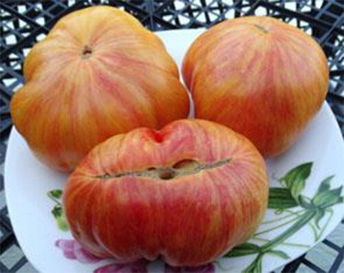 Высокорослый урожайный сорт. Плоды очень красивые, мясистые, многокамерные, сочные, превосходного вкуса. Аромат не сильный, но приятно-томатный. Очень вкусный, гармоничный, со сластинкой и кислинкой. Семян достаточно. Внутри такие же красивые, как и снаружи, оранжево-розовые. Мякоть сочная, мраморная, нежная, волокнистая, но волокна мягкие, приятные. Автор этого замечательного сорта Фрэд Хэмпель. Среднего срока созревания. Высота куста - 1,5 м. Масса плодов: 200-400 г.
