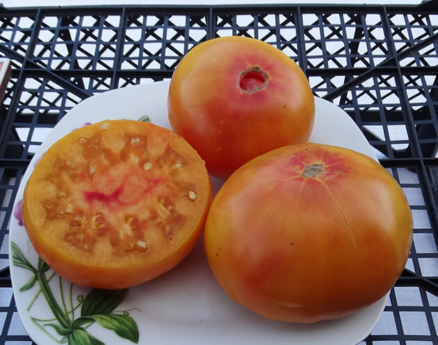 Детерминантный, болезнеустойчивый сорт. Морщинистые простые листья, урожайность выше средней. Плоды красивые, двухцветные, оранжево-розовые. В разрезе мясистые, многокамерные, «мраморные», сочные, превосходного, слегка терпкого, хорошо сбалансированного вкуса. Очень ароматные. Среднего срока созревания. Высота куста - 1 м. Масса плодов: 170-265 г.