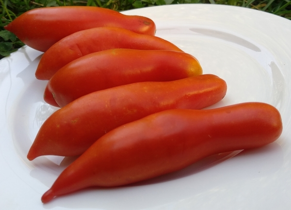 Плоды красные, удлинённые, длиной до 15 см, очень плотные. Идеальны для консервирования, не сочные, поэтому идеально подходят для сушки, сладкие. Очень урожайный сорт - возможно самый урожайный сорт в коллекции. Выглядят как мини помидорные деревья - масса стеблей, плодов и листьев. Среднего срока созревания. Масса плодов: 100 г. Высота куста - 1 м.