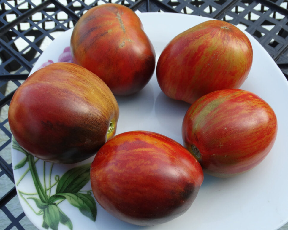 (США) Плоды не крупные, 5-7 см в диаметре. Содержат много антиоксидантов, сочные, имеют сладкий вкус и фруктовый аромат. Цвет плодов красный с желтыми и синими полосками. Но такая расцветка может получиться только при хорошем солнечном освещении. Высокоурожайный сорт. Среднего срока созревания. Высота куста - 1,5 м.  Масса плодов: 70-100 г.