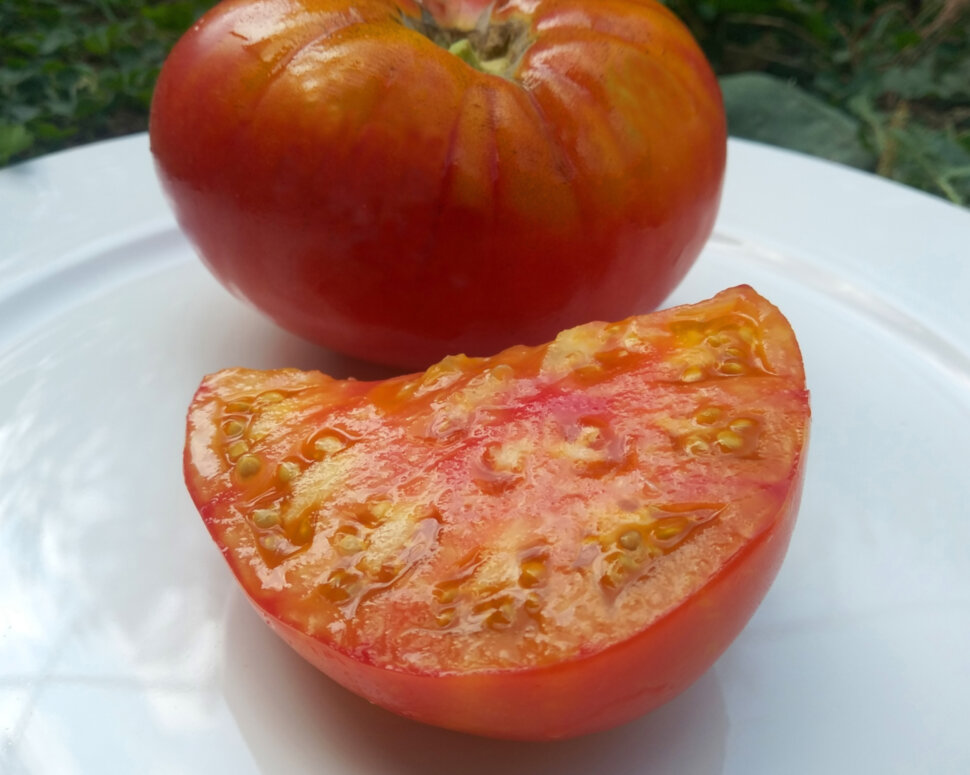 Плоды плоско-округлые, оранжево-розовые, мясистые, на вкус насыщенно сладкие. Мякоть плотная. Высокоурожайный сорт. Высота куста - 1,8 м. Масса плодов около 500 г. Среднего срока созревания.
