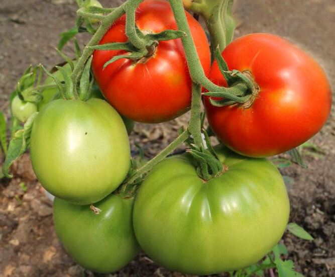 Плоды красные, овальные, плотные, сладкие, сочные. Мякоть очень вкусная, крупнозернистая, как у спелого сахарного арбуза. Высокоурожайный сорт. Высота куста - 2 м. Масса плодов: 200-400 г. Среднего срока созревания.
