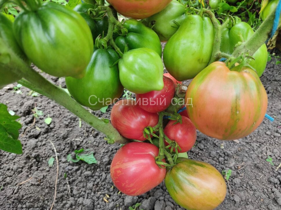 Новый сорт от Дина Слейтера, США. Плоды сердцевидные, обычно с небольшим носиком, малиново-розовые с черточками и полосками разнообразной формы, мясистые, умеренно плотные, насыщенного вкуса, сладкие. Урожайный сорт. Лист обычного типа, морщинистый, можно выращивать без формировки. Плодоношение до заморозков. Масса плодов: 80–130 г. Высота куст - 0,5 м. Среднего срока созревания.