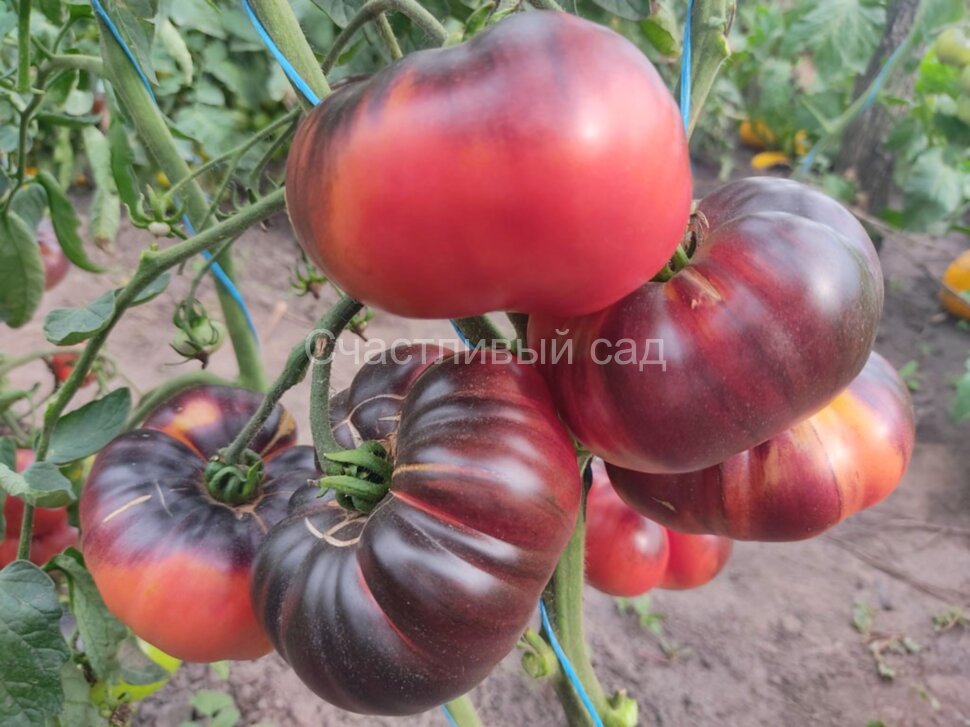 Плоды плоскоокруглые, многокамерные, мясистые, сочные, вкусные, с необычной расцветкой: на розовом фоне синие и чёрные полосы. Высокоурожайный сорт. Кусты с картофельными листьями. Масса плодов: 140-300 г. Высота куста - 1,5 м. Среднего срока созревания.