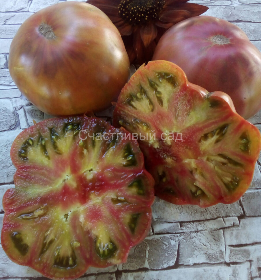 Плоды плоско-округлые, многоцветные: сочетания малинового, сиреневого, оранжевого, жёлтого цветов. Мякоть трехцветная: малиновая с зелёным и белым, приятная на вкус. Урожайный сорт. Масса плодов: 250-300 г. Высота куста - 1,9 м. Среднего срока созревания.
