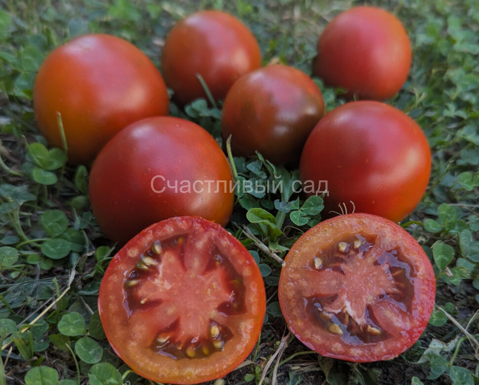 Плоды идеально круглые, коричневые в нижней части и красно-чёрные у вершины, упругие, довольно мясистые и сочные, на вкус не очень сладкие. Их можно срезать кистями. В кистях по 6 плодов. Высокоурожайный сорт. Высота куста - 1,6 м. Масса плодов: 50-70 г. Среднего срока созревания.