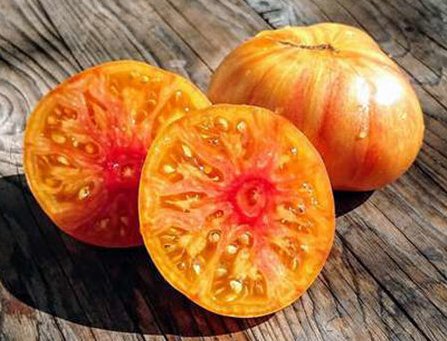 Плоды плоско-округлые, с плечиками, ярко жёлто-оранжевые с более тёмными полосками жёлтого и розового цвета. Мякоть жёлтая с мраморным узором в розовых тонах, сочная, сладкая. Кожица тонкая, но прочная, не склонная к растрескиванию. Растения компактные, детерминантные. Урожайный сорт, устойчив к заболеваниям. Сорт - одна из линий Beauty селекционера Vince Lavallo, полученный от скрещивания сортов Beauty King и Dwarf Wild Fred. Масса плодов: 150-300 г. Высота куста - 1,2 м. Среднего срока созревания.