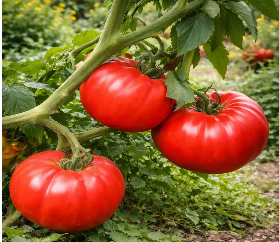 Плоды — настоящие гиганты, округло-плоской формы, иногда с выраженной сердцевидностью. Окраска насыщенная, глубокая розовая, мякоть плотная, мясистая, с минимальным количеством семян. Структура плодов прочная, благодаря чему они отлично переносят транспортировку и долго сохраняют товарный вид. Высота куста - 1,5 м. Масса плодов: 200-500 г. Среднего срока созервания.