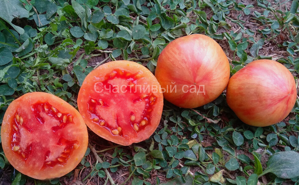 Плоды округло-сердцевидные, слегка ребристые на плечиках, с носиком, коричнево-бордовые с серебристыми полосами и штрихами. Мякоть плотная, сладкая, сахаристая на изломе. Высокоурожайный сорт, с длительным периодом плодоношения и дружным созреванием. Кусты с морщинистой светло-зелёной листвой. Подходят для выращивания в больших горшках или ведрах. Масса плодов: 100-150 г. Среднего срока созревания. Высота куста - 0,6 м.